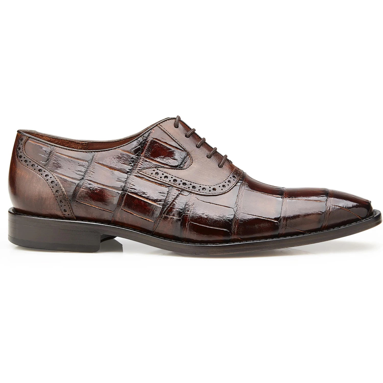 Belvedere does not use the “painted-on” process to color these shoes like other manufacturers; instead, they use a special tanning process to glaze the premium grade alligator / Italian calf .