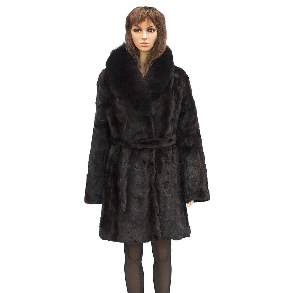 Winter Fur Ladies Brown Front Paws 3/4 Coat With Fox Collar And Belt W69Q06BR