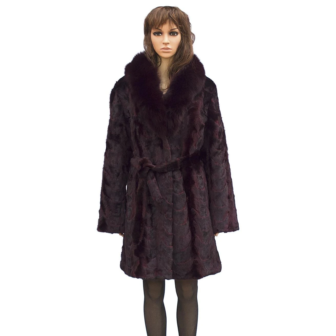 Winter Fur Ladies Burgundy Mink Front Paws 3/4 Coat With Fox Collar And Belt W69Q06BD