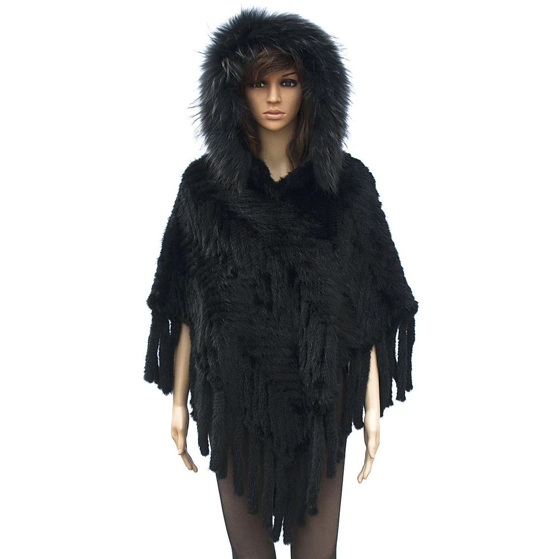 Winter Fur Ladies Knitted Black Mink Poncho With Hood W09K01BD